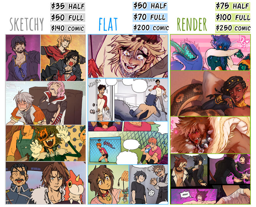 | $35 half-body $50 full-body | $140 comic page (base price, 2ch 1pg) |